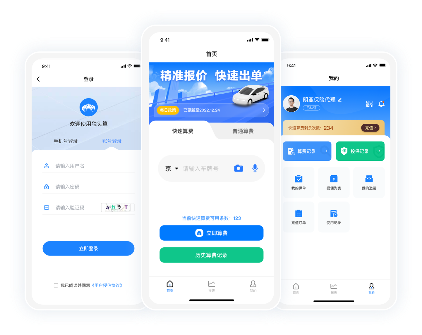 简便高效的展业、算费、出单工具,输入车牌号码一键实现跨保司算费